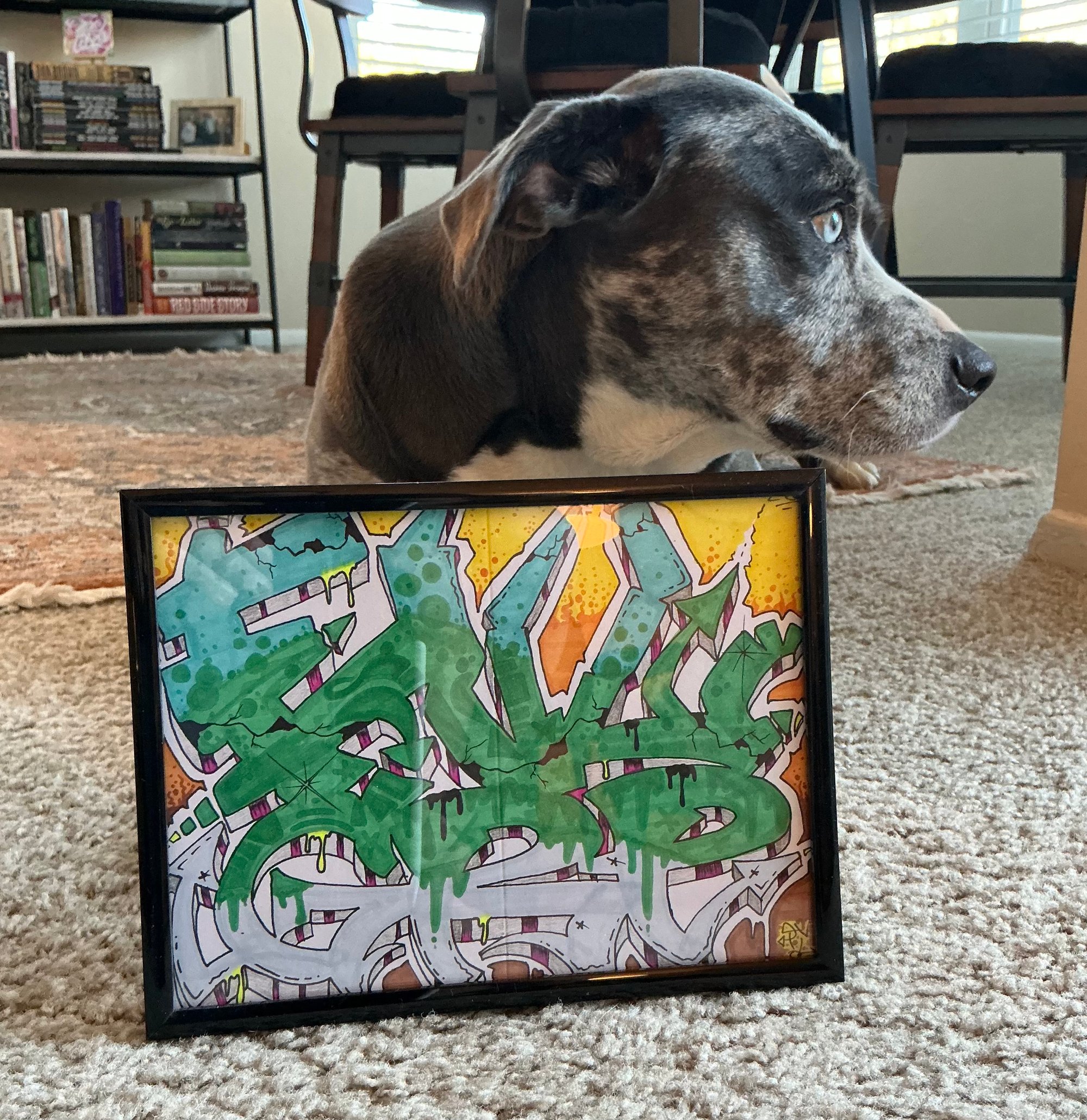 This is an original one of a kind piece by “evil.” Alcohol markers on heavy card stock. 8"x10" self standing or wall mountable frame