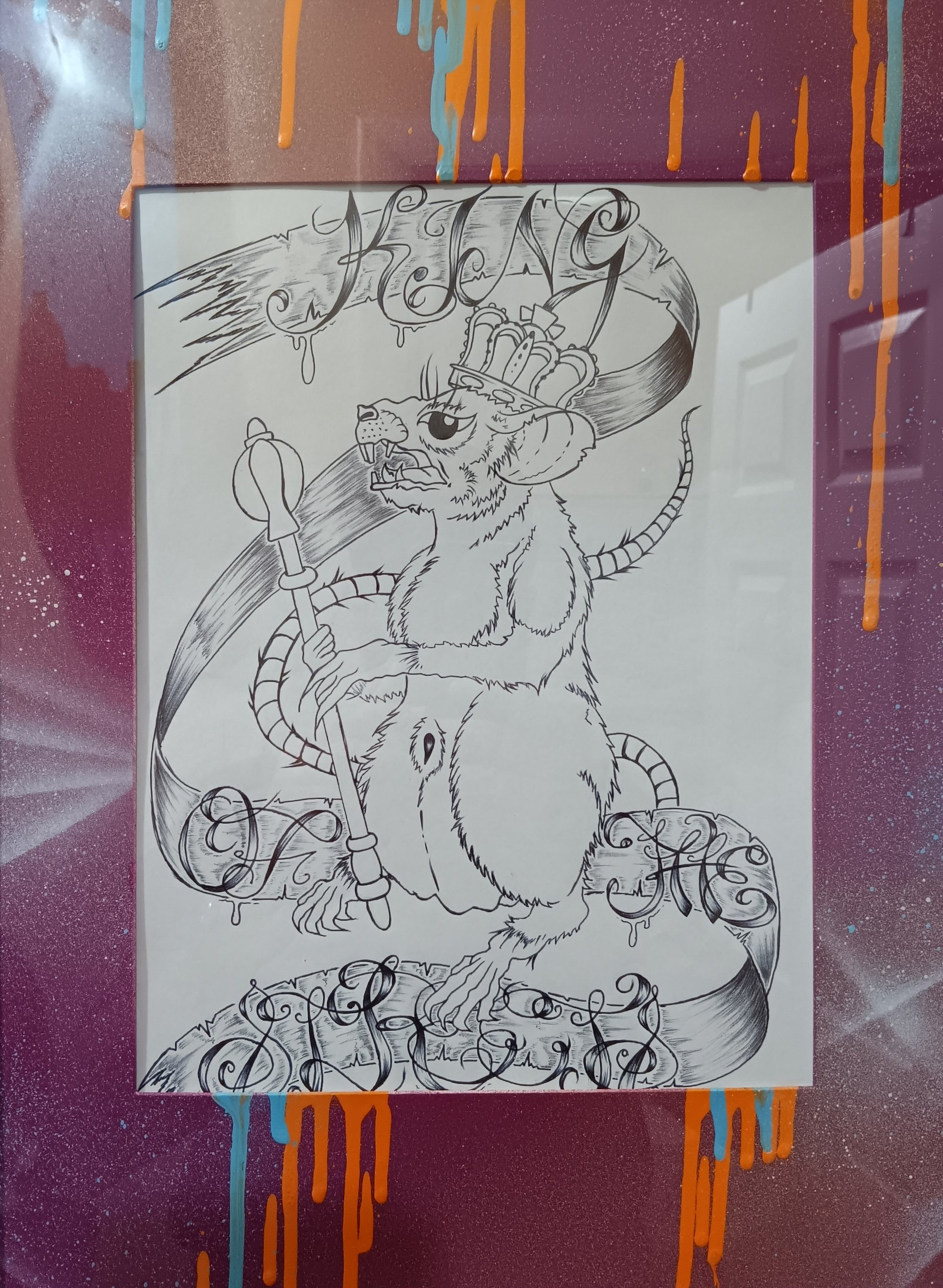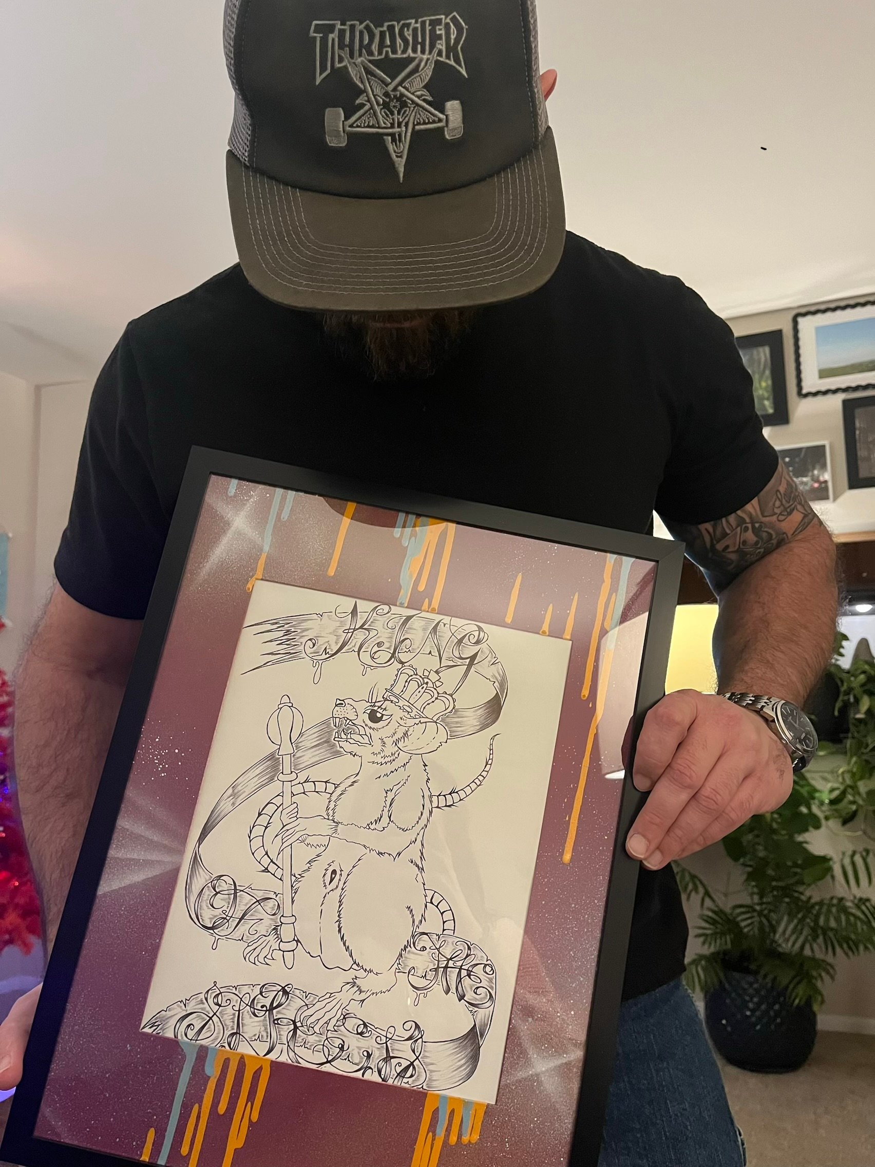 Black ink on white paper with a custom frame by “evil.” Frame is 12” x16” matted to 8.5”x11” display.